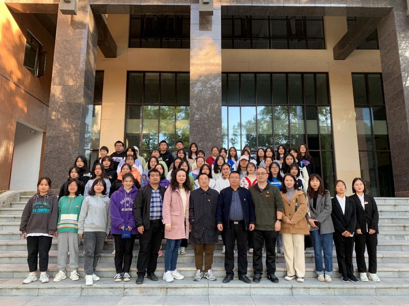 最后,参加见面会的师生在大田湾校区图书馆门口合影留念。