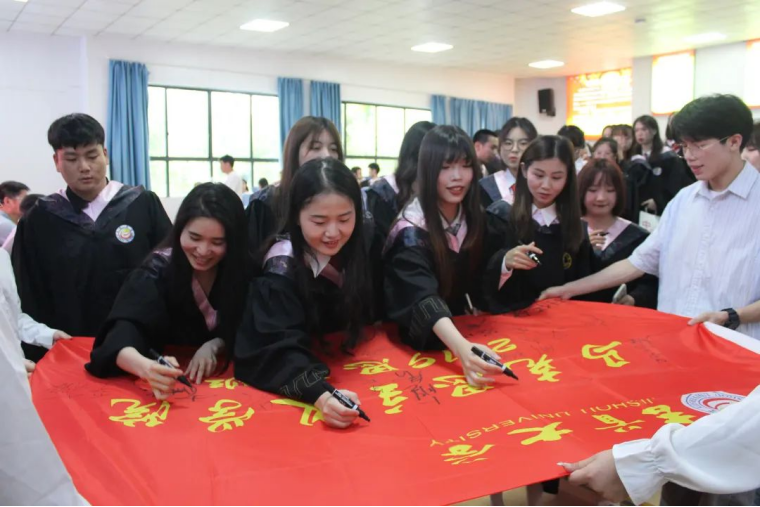 典礼氛围融洽,而接下来的肄业生向毕业生赠送明信片环节、班旗签名回收仪式更是将氛围推向高潮。在场的老师和同学们脸上都洋溢着温暖幸福的笑容。