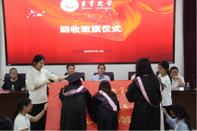 活动现场,肄业生首先向毕业生赠送手写祝福明信片。接着,班旗回收环节中,全体师生在旗帜上郑重签名,这面承载集体记忆的班旗,成为马院学子传承使命的庄严象征。最后,毕业欢送会在全体师生齐唱校歌的激昂旋律中圆满落幕。