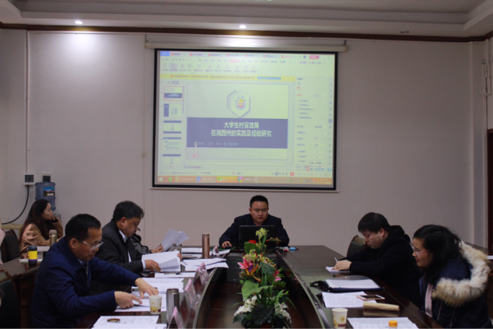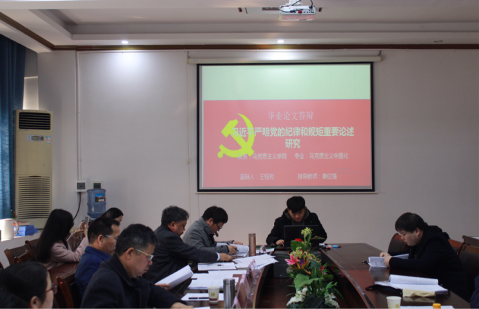 王钰松的论文题目是《习近平严明党的纪律和规矩重要论述研究》,他主要从习近平严明党的纪律和规矩的重要论述的时代、习近平严明党的纪律和规矩重要论述的主要内容、主要途径和历史地位来介绍。最后彭帅同学向答辩委员展示他的论文:《老员工村官政策在湘西州的实践及经验研究》。