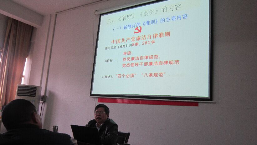 公司党总支书记朱廷岚教授做了“学习贯彻《准则》《条例》做遵纪守规的模范”的辅导报告。他首先讲了组织学习《准则》《条例》两部党内法规的原因。一是贯彻落实中共中央办公厅《关于认真学习贯彻〈中国共产党廉洁自律准则〉和〈中国共产党纪律处分条例〉的通知》。《通知》要求各级党委(党组)要统筹安排,把两部党内法规纳入党委中心组学习、党课、党校教育课程、党员学习规划中,集中一段时间加强学习教育。广大党员要逐条学习,熟练掌握两部党内法规,牢记各项廉洁自律要求和党的纪律底线。二是公司的特殊性所决定。公司是进行马克思主义理论教育的主渠道和主阵地。广大教师不仅自己模范学习遵守党的纪律,自觉同党中央在政治上思想上行动上同党中央保持一致,还要教育广老员工成为政治过硬、信念坚定、纪律严明的接班人。然后他从党的纪律的含义、意义、特征;《准则》《条例》修订的原因、背景、原则;《准则》《条例》的内容;自觉践行《准则》《条例》四个方面,结合公司实际做了深入的讲解。透彻分析了新规中“正面倡导、重在立德”和“负面清单、重在立规”的特点。认为新修订的两项党内法规,充分体现了党中央全面从严治党的坚强决心,旨在一方面通过廉洁自律准则确立高标准,一方面通过党纪处分条例守住最底线,从而在全党树立起党规党纪的权威性和严肃性。朱书记要求公司全体党员自觉践行《准则》和《条例》,其中认真学习是前提,自觉践行是根本,落实责任是保障。党员同志要把自己摆进去,联系具体情况,联系自己的职责,联系自身思想、工作和生活实际,解决最突出问题,增强针对性和实效性。