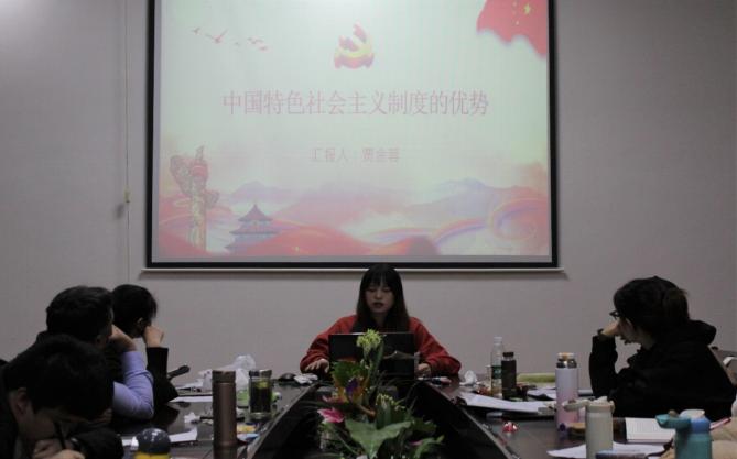 首先,围绕“坚持和完善新时代中国特色社会主义制度”这个主题,三位同学依次上台向老师同学们分享自己的研究成果。罗晶晶以“中国共产党的领导优势”为切入点,将党的领导优势具体分为三个方面,分别是强大的组织优势、先进的制度优势、与时俱进的理论优势。贾金蓉从中国特色社会主义制度有利于解放和发展社会生产力、有利于确立和落实人民的主人翁地位、有利于维护和促进社会公平正义、有利于整合社会资源集中力量办大事、有利于维护民族团结与国家统一五个方面解读了中国特色社会主义制度的优越性。李小芳则从中国共产党坚持“人民主体思想”角度分析了中国特色社会主义的制度优势。三位同学认真详细的分享自己的研究成果引起了同学热烈的讨论。两位老师也分别提出针对性指导意见。
