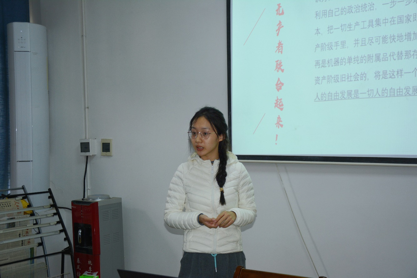 接着 ,马克思主义理论班李一婷同学所在小组以《共产党宣言》为主题汇报,从未来社会设想、实现路径及当代启示三方面展开。