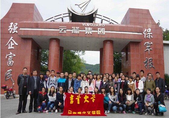 湖南云箭集团有限公司系中国兵器装备集团公司直属的国家大型军民结合型企业。现有员工3200余人,资产总额12亿多元。公司前身为1890年湖广总督张之洞创办的湖北兵工厂,1938年由湖北汉阳迁至现址,迄今已有124年历史。近年公司先后投入技术改造资金4亿多元,从德国、美国、瑞士等国家引进先进的加工中心等现代化设备,拥有各类设备3800多台(套),形成多条产品生产线。云箭牢记“保军报国,强企富民”使命,秉承“诚信、感恩、敬业、创新”的企业价值观,“传承百年历史,再铸云箭辉煌”,特别是近年来工厂适应空军“空天一体、攻防兼备”战略转型,坚持自主创新、科技领先,大力发展新一代先进航空武器装备,实现了由普通航空弹药生产向制导航空弹药科研制造的历史性跨越,建设成为国内一流、国际水准的先进制导航空弹药研制生产基地,成为我国航空弹药发展领域的标杆和引领者。在这里,全体师生体验了云箭集团深厚的历史文化底蕴、浓烈的企业文化氛围、先进的生产销售理念、前沿的科技研发装备、国防领域里的重大贡献,受到了“保军强军报国”的爱国主义以及中国国防自信的深刻教育。