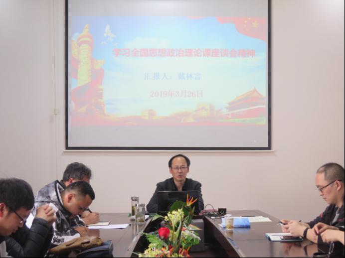本网讯(文/高颖)3月28日下午三点,公司“学习全国思想政治理论课座谈会精神”会议在公司会议室召开。经理廖胜刚教授,公司党委书记戴林富教授,朱廷岚教授、李乐为教授、廖金香副教授、吴恒同副教授、王飞霞副教授等公司老师参加会议,公司全体研究生参与学习。会议由廖胜刚经理主持,公司党委书记戴林富作主题报告,公司老师和同学们共学会议精神,交流学习体会。