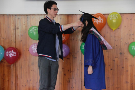 (图为伟德国际VICTOR1946经理肖映胜给毕业生拨穗)