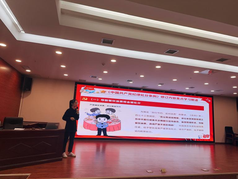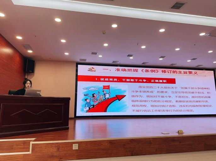 宣讲队员张心雨以“新修订《中国共产党纪律处分条例》学习解读”为题,从准确把握《条例》修订的主旨要义和抓好《条例》的贯彻执行,以严明的纪律推进党的自我革命两方面进行了深入讲解。她指出,党员干部要守住纪律“底线”、不越“红线”,引导党员干部自觉学纪、知纪、明纪、守纪。