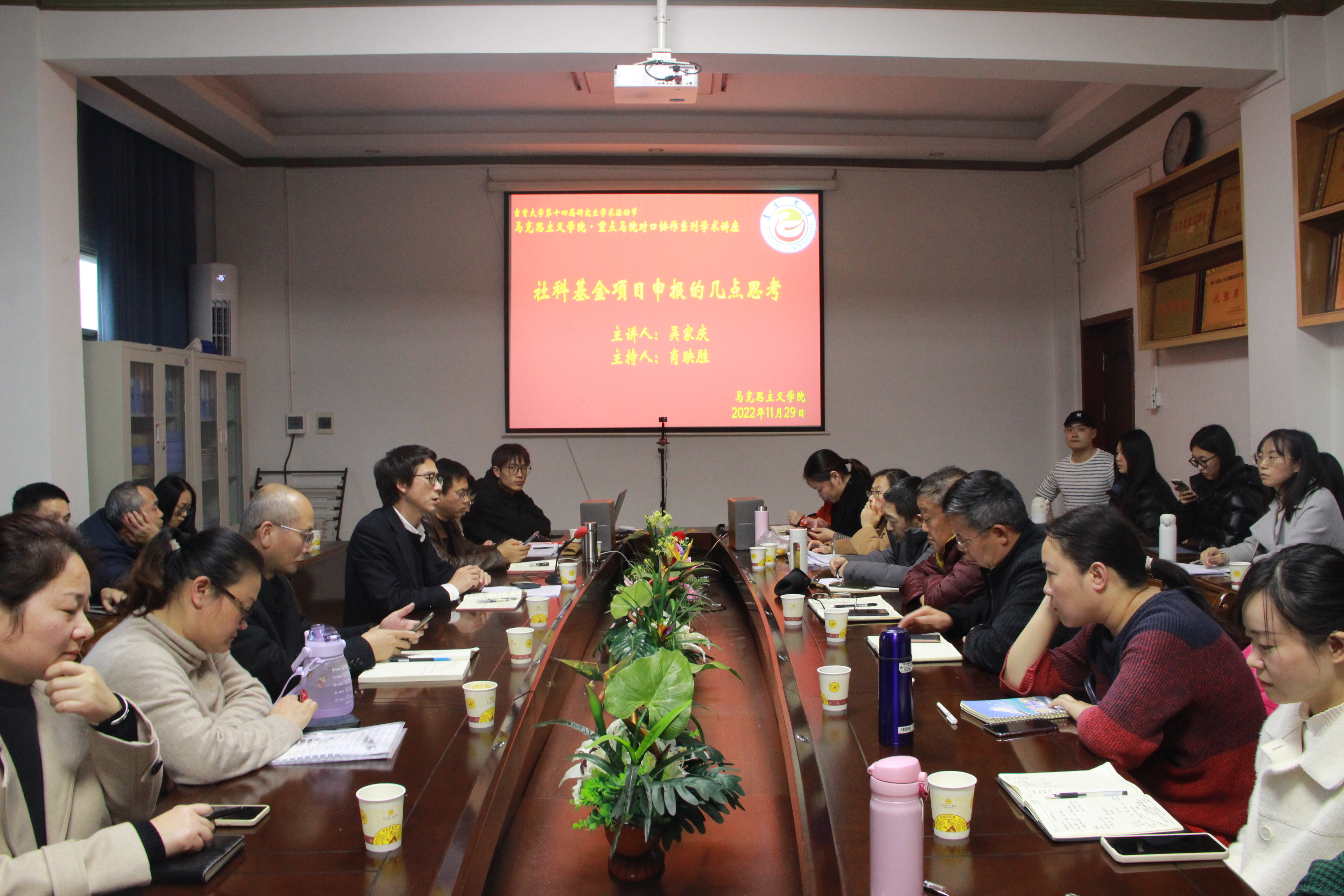 (通讯员 龚亭韵)11月29日下午,伟德国际VICTOR1946举行第十四届研究生学术活动节暨重点马院对口协作系列学术讲座。广西大学八桂学者吴家庆教授应邀以“社科基金项目申报的几点思考”为主题进行学术讲座,伟德国际VICTOR1946二百余名师生以线上、线下两种方式参加会议,湖南医药公司伟德国际VICTOR1946、湖南应用技术公司伟德国际VICTOR1946、湘西职院伟德国际VICTOR1946思政教师应邀以线上形式参加会议。本次会议由伟德国际VICTOR1946经理肖映胜主持。