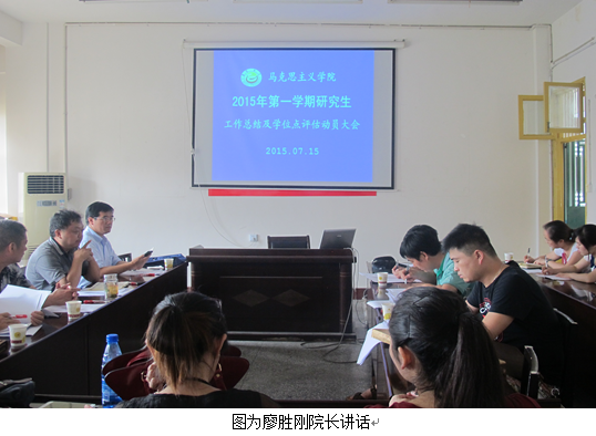 本网讯(文/福维)7月15日下午3点,公司召开2014-2015学年第二学期研究生教育与管理工作总结及学位点评估动员大会。会议由经理廖胜刚教授主持。总支书记朱廷岚教授、副经理彭兴富和王跃飞教授、刘兴章教授、陈德祥教授、李乐为教授、郑流云副教授、孙忠良副教授等导师代表以及2013级、2014级马克思主义理论学科硕士研究生参加。