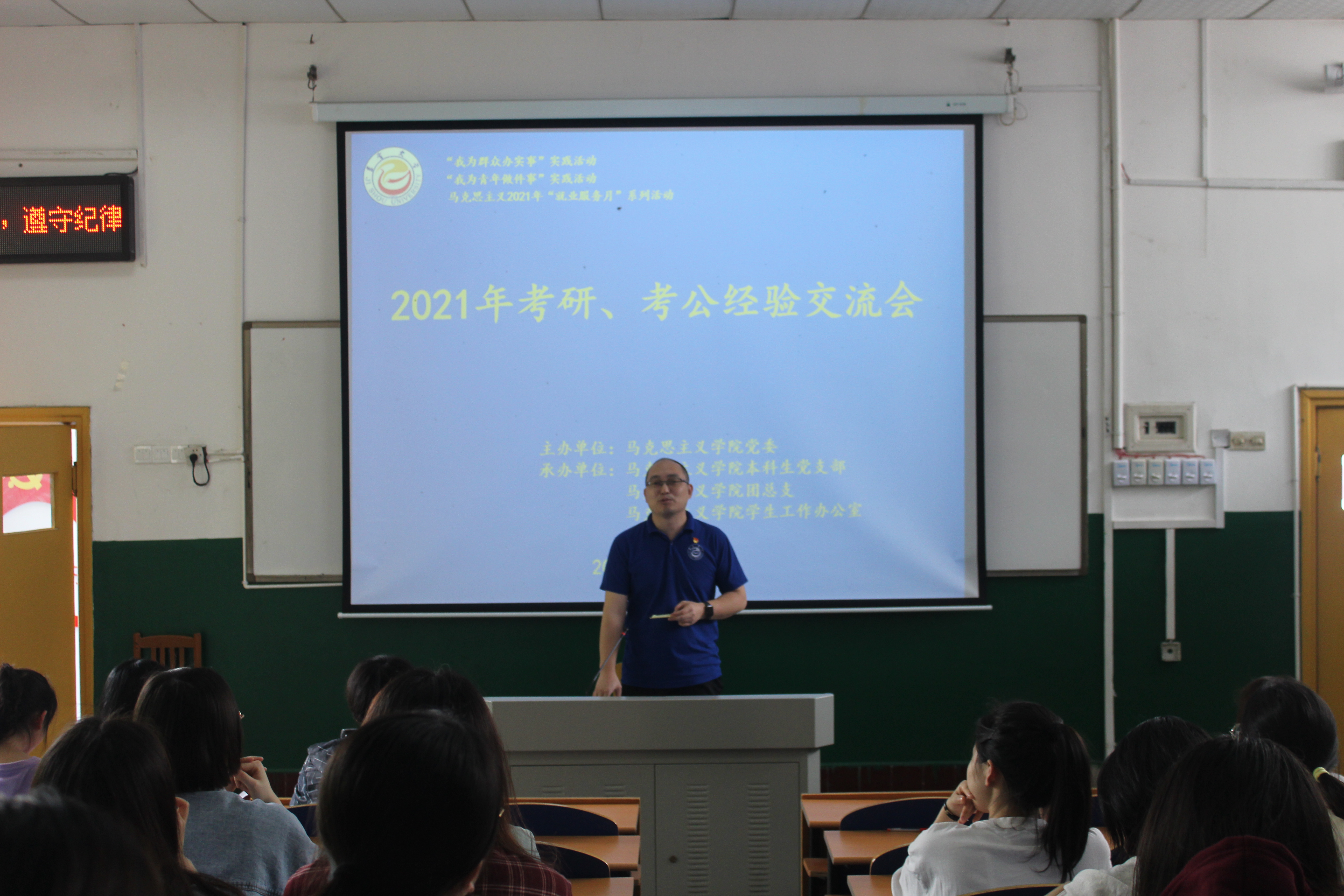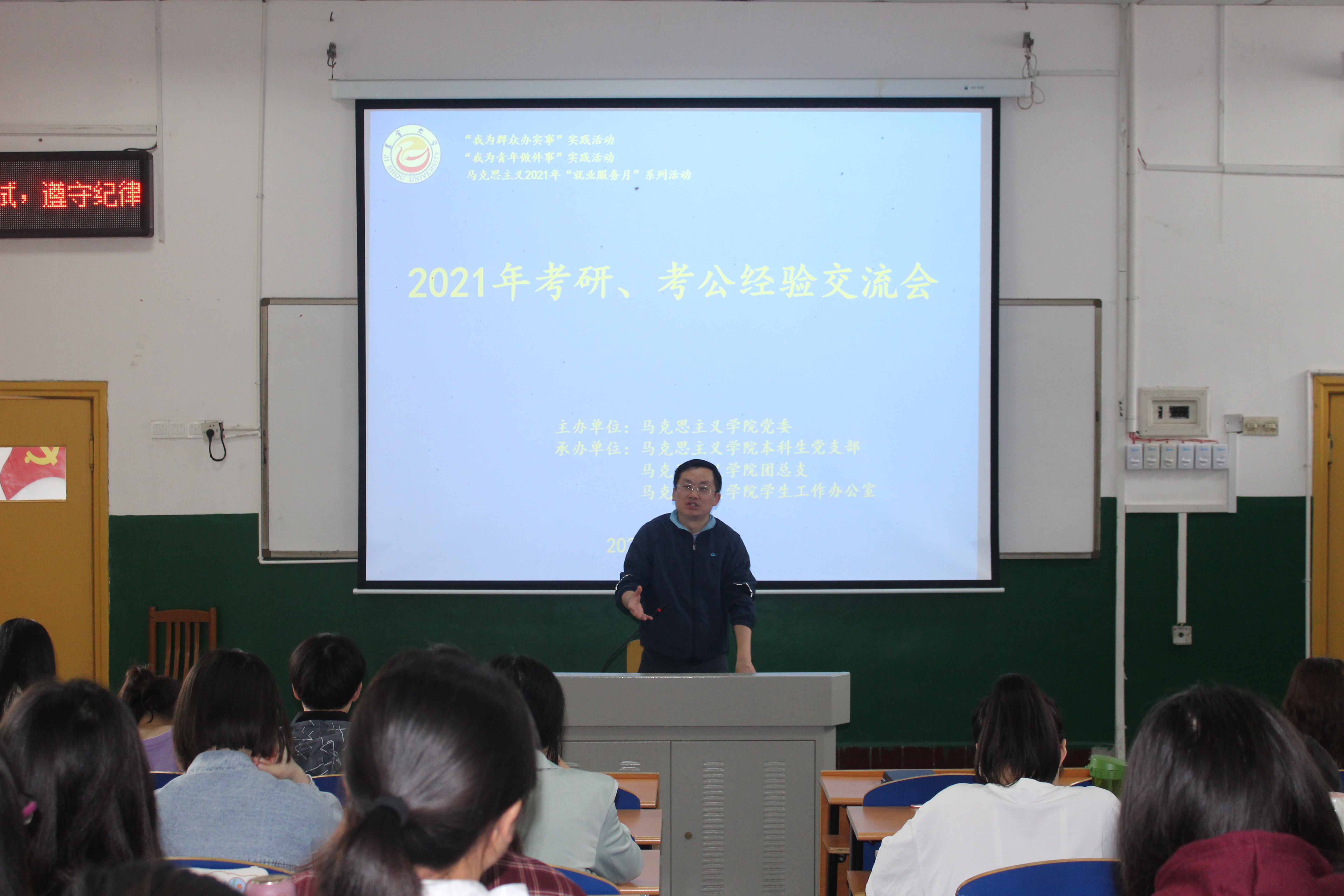 本网讯(通讯员 文名欣 陈凯)根据公司有关党史学习教育相关文件精神,为把党史学习教育成果体现在行动上、落实到工作中,由公司党委主办、院本科生党支部和院团委承办的 “‘我为群众办实事’暨‘我为青年做件事’实践活动之考研、考公经验交流会” 于5月18日下午3点在思政园1206教室举行。本次会议由辅导员陈凯老师主持,公司党委副书记柴绪亮老师出席会议并发言。公司结合个人意愿从伟德国际VICTOR19462021届毕业生中,选派3名员工党员和4名优秀共青团员,就自己考研或考公务员的经历和感悟,进行经验总结、分享和交流。2018级全体同学以及其他年级部分同学参加本次经验分享会并进行深入交流。